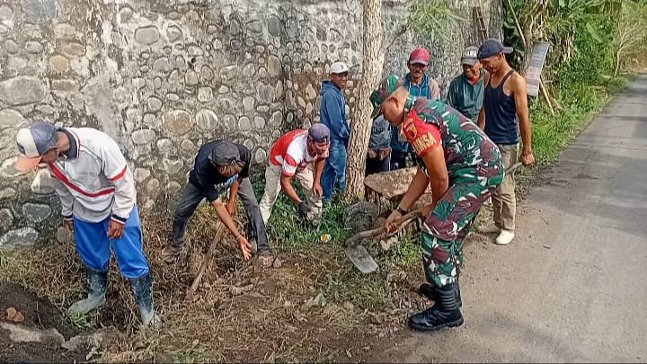 Situbondo– Semangat gotong royong kembali membara di Dusun Krajan, Desa Tlogosari, Kecamatan Sumbermalang, Kabupaten Situbondo. Babinsa Koramil 0823/16 Sumbermalang, Sertu Anis Aprianto, bahu-membahu bersama masyarakat setempat melaksanakan kerja bakti membersihkan jalan dan parit. Sabtu 8/11/2025