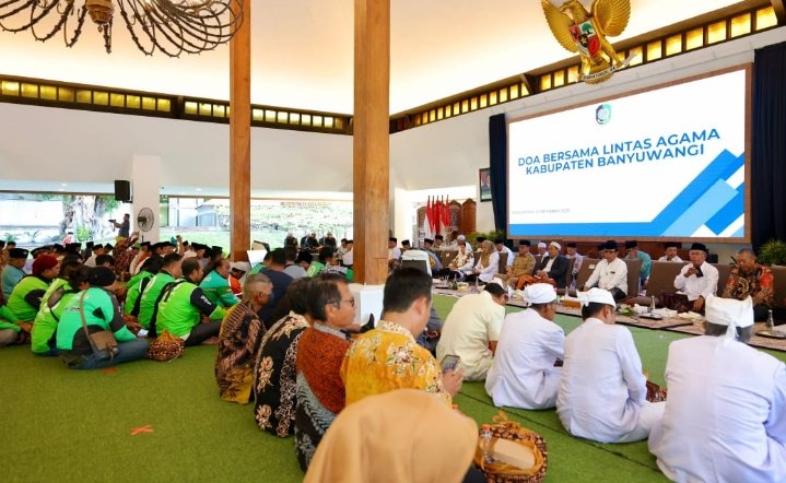 BANYUWANGI – Berbagai elemen masyarakat menggelar doa bersama di Pendopo Shaba Swagata Blambangan Kabupaten Banyuwangi, Senin (1/9/2025). Mereka memanjatkan harapan kepada Tuhan Yang Maha Esa untuk menjaga kedamaian kabupaten di ujung timur Pulau Jawa tersebut.