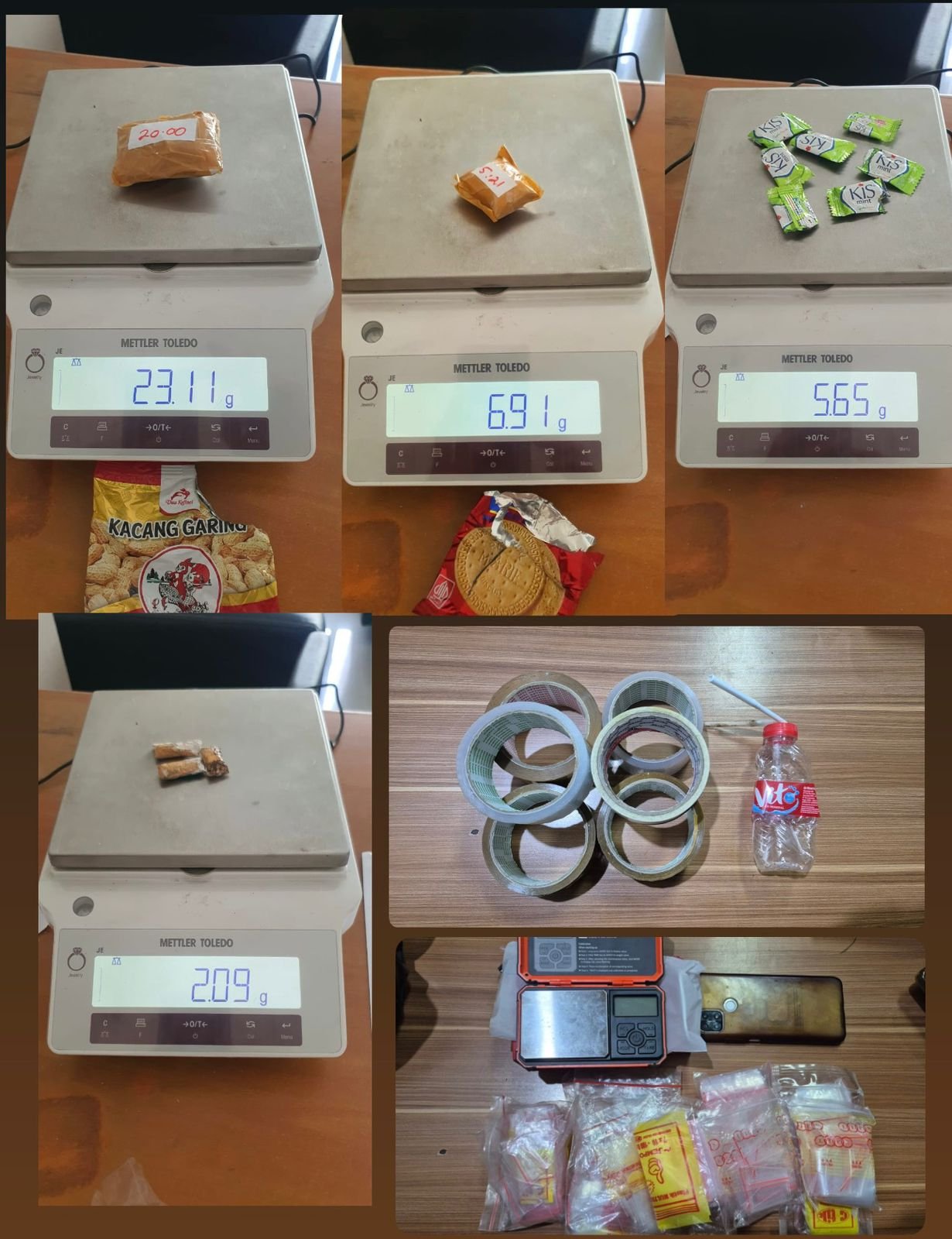 2,09 gram sabu dalam 3 klip plastik lain. Selain itu, ditemukan juga 1 timbangan elektrik, 6 buah lakban, plastik klip kosong, tas, dan ponsel merk Oppo.