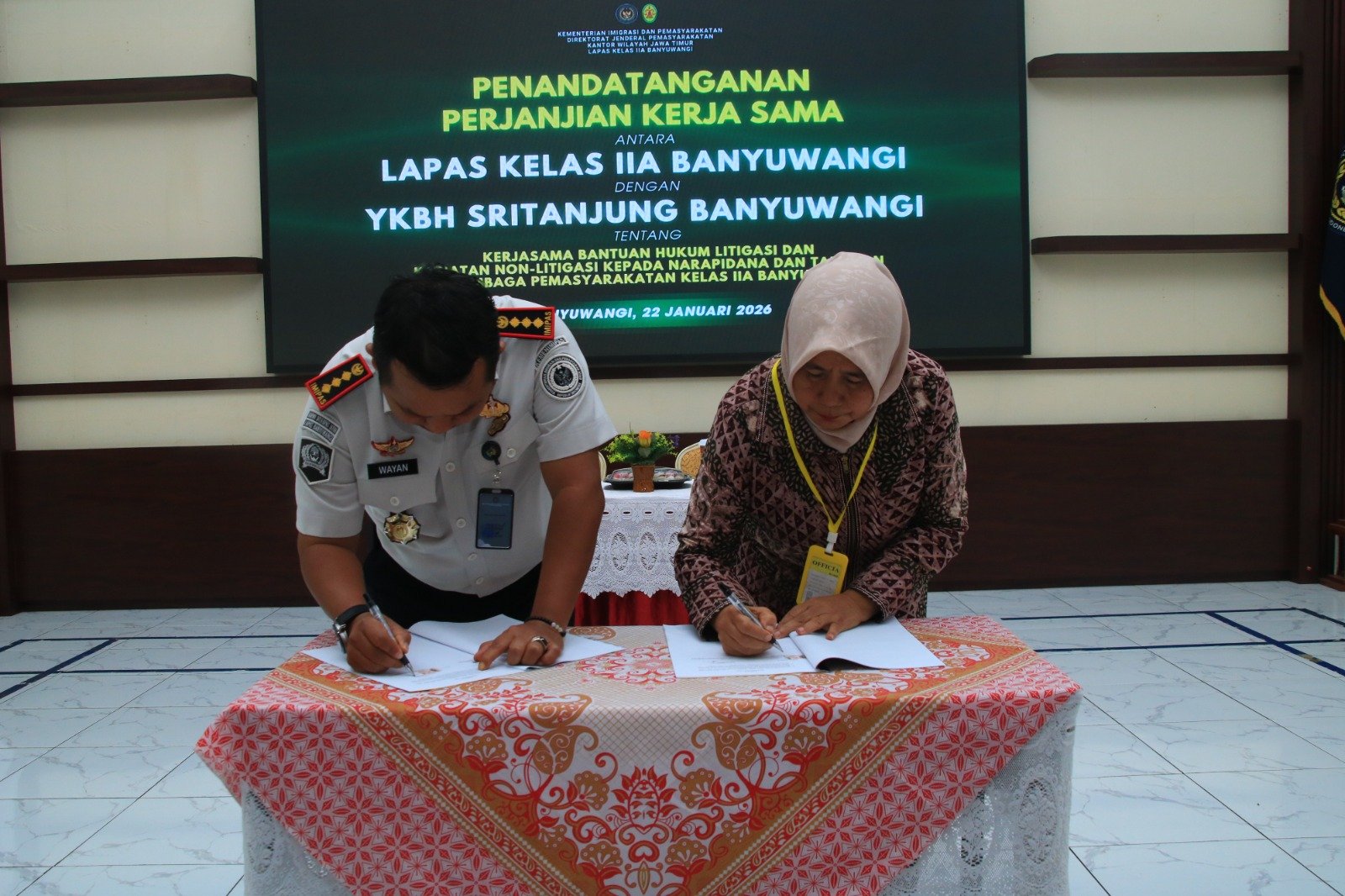 Banyuwangi – Lembaga Pemasyarakatan (Lapas) Kelas IIA Banyuwangi terus berkomitmen memberikan perlindungan hak hukum bagi warga binaannya. Hal ini ditegaskan melalui penandatanganan Perjanjian Kerja Sama (PKS) antara Lapas Banyuwangi dengan Yayasan Konsultasi dan Bantuan Hukum (YKBH) Sritanjung Banyuwangi, Kamis (22/01/2026).