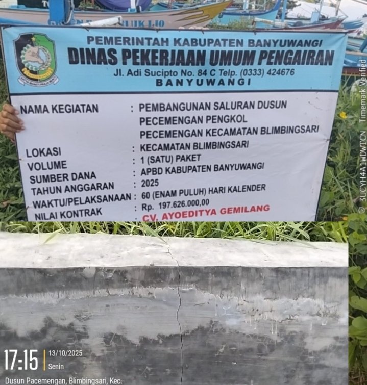 Banyuwangi|Proyek pembangunan saluran di Dusun Pecemengan Pengkol Kecamatan Blimbingsari Kabupaten Banyuwangi dengan Nilai Kontrak: Rp. 197.626.000,00 di Duga pekerjaan saluran tidak sesuai spesifikasi terlihat dilapangan baru seumur jagung sudah banyak mengalami keretakan.