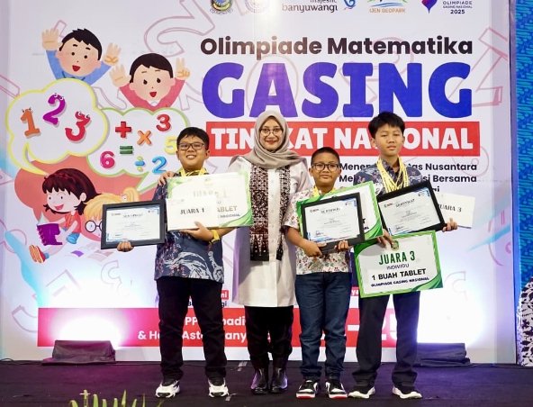 LBANYUWANGI – Dua pelajar asal Kabupaten Banyuwangi sukses mencetak prestasi di ajang Olimpiade Matematika Gasing Tingkat Nasional (OGN) tahun 2025. Dua pelajar tersebut adalah Tristan Maheswara Dandiansyah sebagai peraih juara 1, dan Deva Yogiswara yang meraih juara 3.