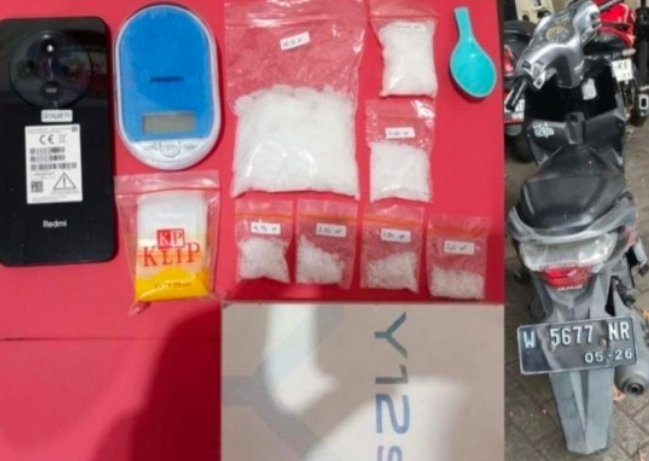Selain sabu yang dikemas dalam tujuh plastik klip dengan berat bervariasi, petugas juga mengamankan sejumlah barang bukti lain berupa satu unit timbangan elektrik, satu unit handphone, plastik klip kosong, sendok plastik, dos box HP, serta satu unit sepeda motor Honda Vario.