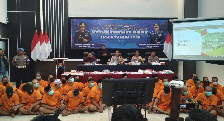 Banyuwangi – Polresta Banyuwangi menggelar Konferensi Pers Akhir Tahun 2025 yang dipimpin Kapolresta Banyuwangi, Kombes Pol. Dr. Rama Samtama Putra, S.I.K., M.Si., M.H. bersama pejabat utama lainya di Rupatama Mapolresta Banyuwangi, Selasa (30/12/2025).
