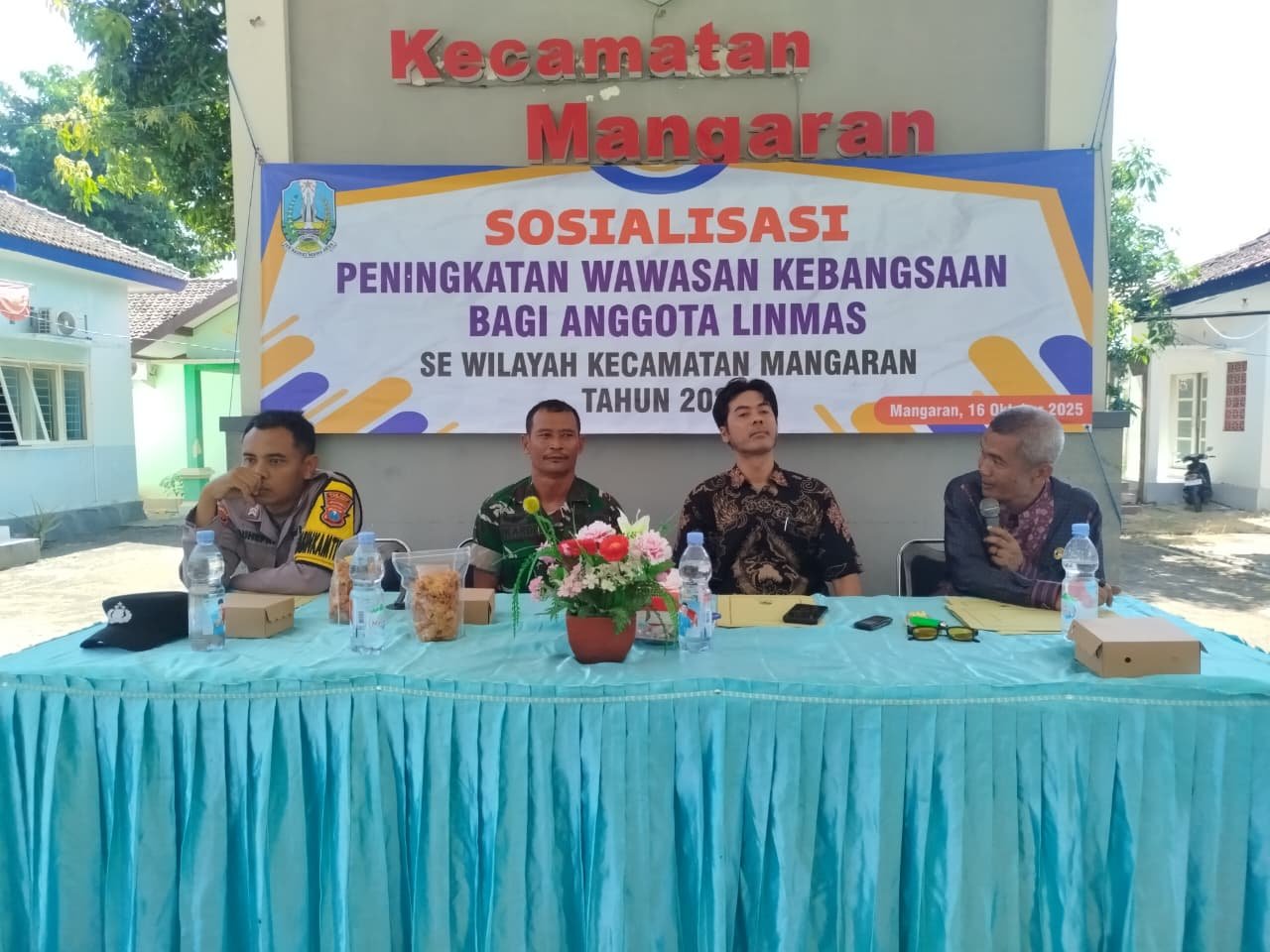 Dalam kegiatan tersebut turut hadir Camat Mangaran Abdul Kadir, S.H., Kapolsek Mangaran yang diwakili oleh Bripka Suhefri, Kasi Trantib Kecamatan Mangaran Bapak Faturohman, jajaran kepala desa se-Kecamatan Mangaran, serta anggota Satuan Perlindungan Masyarakat (Satlinmas) dari tiap-tiap desa. Sosialisasi ini bertujuan memperkuat pemahaman dan peran Satlinmas sebagai garda terdepan dalam menjaga keamanan dan ketertiban lingkungan di tingkat desa.