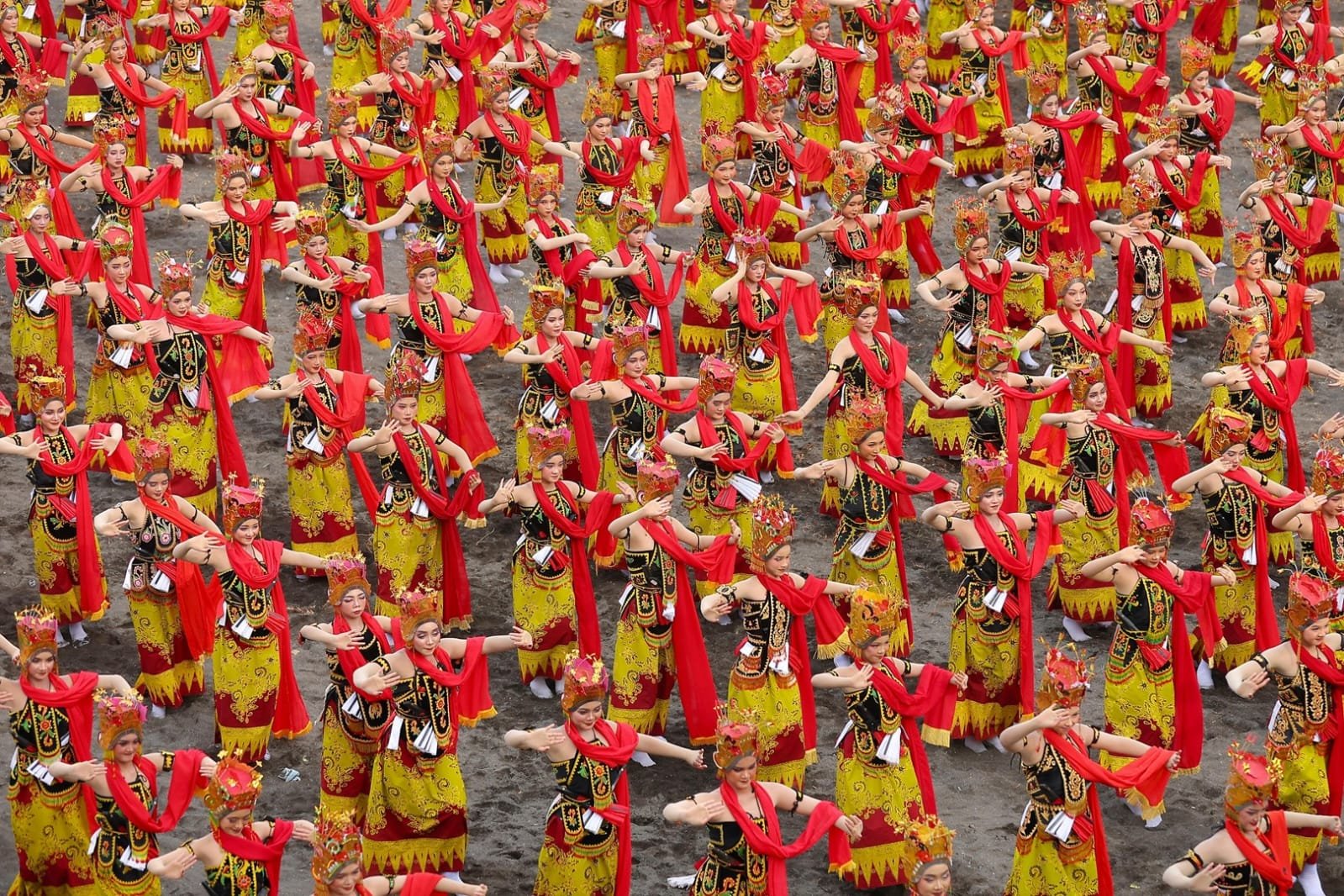 BANYUWANGI – Memasuki tahun ke-13, pagelaran kolosal Gandrung Sewu kian memukau. Menghadirkan 1.400 penari dengan tema “Selendang Sang Gandrung”, penampilan ribuan penari dengan koreografi gerakan yang anggun dan harmonis memukau ribuan penonton yang memadati Pantai Marina Boom, Sabtu (25/10/2025).